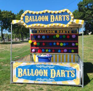 How it Works: Step right up and test your aim! Balloon darts involves a wall or board covered in bright balloons. Players get a set of darts (usually 3) and try to pop the balloons by throwing the darts. Every pop can correspond to a prize, or popping a certain number of balloons wins a bigger reward. The visual of a wall of balloons is exciting in itself – and the POP! sound when you hit one is even better.