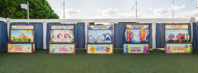 1Transport your guests to the golden age of seaside fun with our Beach Boardwalk Carnival Stalls — a stunning five-stall experience styled to recreate the iconic feel of a coastal boardwalk midway. With striped tents, colorful signage, and classic carnival games, this rental package adds vintage charm, vibrant visuals, and interactive fun to any event.