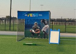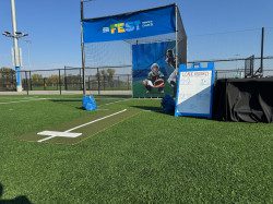 1Who's going to be the next Jon Lester? The Speed Pitch clocks the speed of a participants throw using a high tech radar gun. Make a contest out of it: The fastest throw of the day wins or guess your speed for a prize. This is a perfect item for corporate sports nights, award ceremonies or any other baseball themed event needing a pitching cage that will finally fit indoors. Deluxe version include marquee and speed pitch flooring. Plush not included but can be added on for an additional cost.
