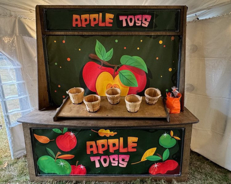 1A portable, fall‑themed carnival booth with target baskets and soft "apples" for tossing — easy to set up and run, perfect for school fairs, harvest festivals, and backyard parties for all ages.