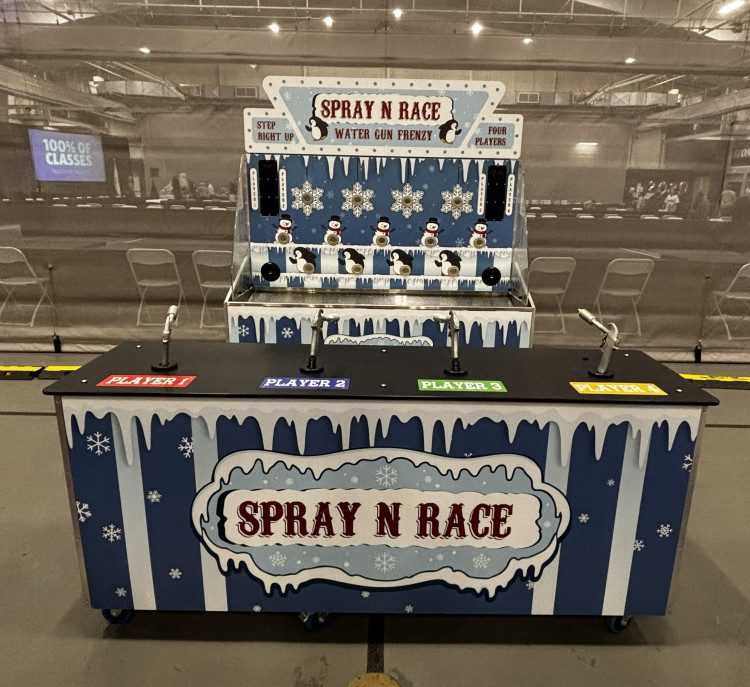 Bring high-energy fun and frosty competition to your event with the Spray ’N’ Race – Snowflake Edition! This 4-player winter-themed water race game brings all the nostalgia of the carnival midway, wrapped up in icy blue snowflakes and twinkling lights. Players compete head-to-head, racing to see whose stream can hit the target and raise their tower the fastest — all while the crowd cheers them on!